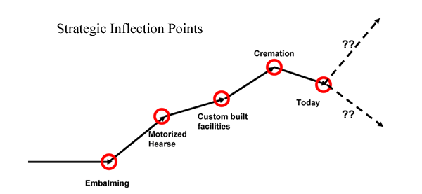 Subsequent and less dramatic inflection points occurred over the years until 30 years ago cremation, specifically cremation without the sale of a casket, caused the first downward trending inflection. Until then, small adjustments or adaptations enabled effective “course corrections” that created market advantages for those who took advantage of them.